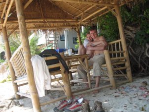 Lunch på en restaurang som var precis som i resereklamen för parresor och i de romantiska filmerna – avskilt läge, inga andra gäster (just då…), 3 m mellan restaurangen och stranden (som givetvis var helt öde), den pittoreska lilla träbåten låg förtöjd vid en uppstickande påle en bit ut i vattnet och sittplatserna var byggda i bambu och med ett vasstak över varje bord.