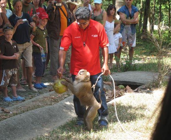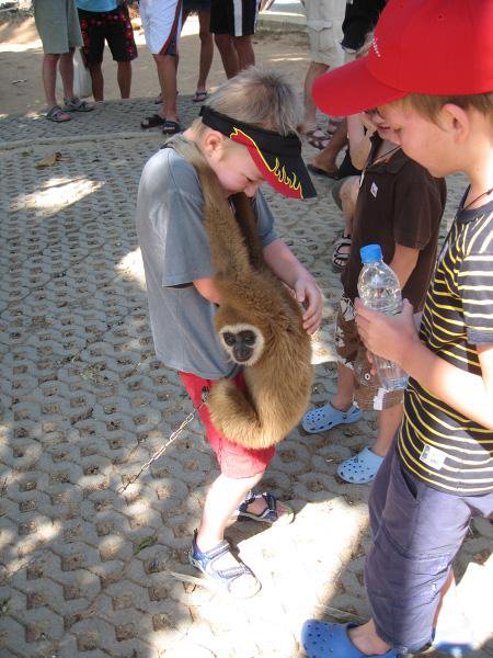 Efter det fler tveksamheter med en apshow bestående av ett enda nummer där en babian i kedja klättrar upp i en kokospalm och desperat försöker få ner en omogen kokosnöt (tror fasen att den är svår att få loss), och utanför sitter en annan apa av något slag fast i en kedja och är till för barnen att leka med. Den sista apan var RÄTT stressad i slutet kan man säga, men inte sjutton kunde han ta sig någonstans för att komma undan barnen…Bakom apan kedjade dom förresten sen fast den minsta av babyelefanterna och där stod han och slängde med huvudet fram och tillbaka i minst en timme (så länge satt vi f.ö kvar i väntan på vår hämtning). Åsa (svägerska) sa att elefanten påminde om skadade barn på barnhem; barn som blivit okontaktbara och bara vaggar fram och tillbaka.