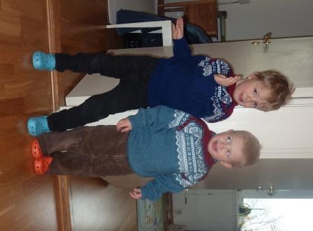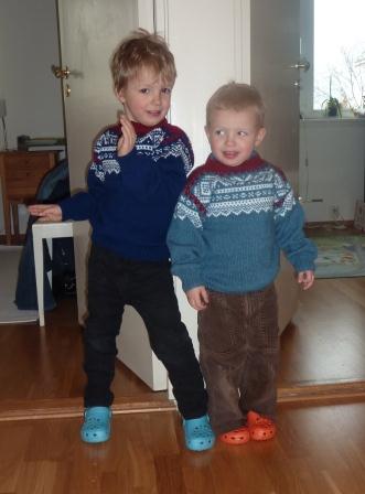 Mamma har fått otrolig fart på stickorna, och bortsett från alla snygga tröjor hon gjort till sig själv så har hon gjort varsin Mariusgenser till A o H. När dom var färdiga fanns de att beskåda direkt från handarbeterskan här, men så här ser dom ut när dom är på: