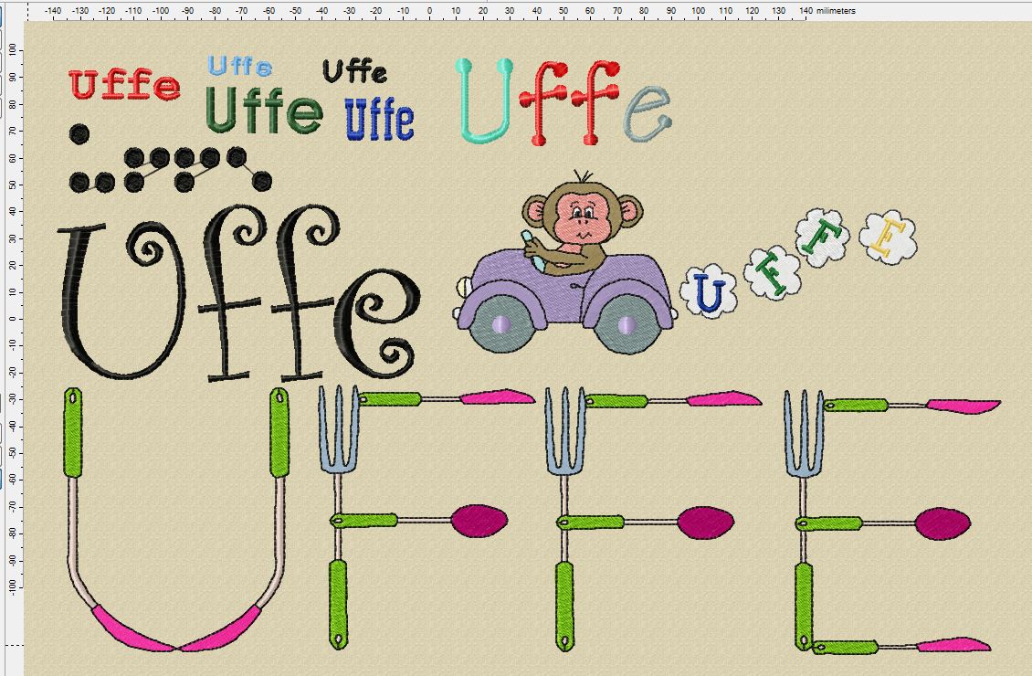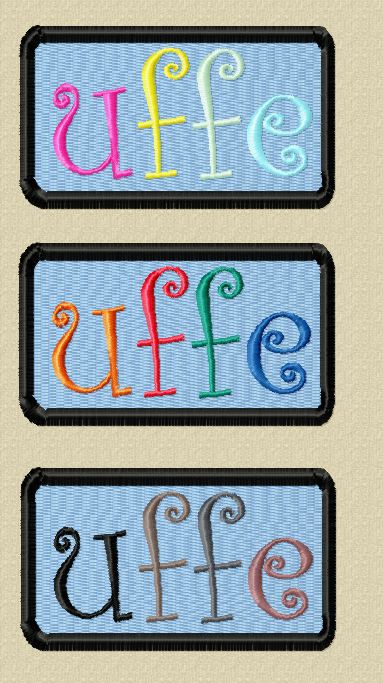 Vi har vädrat ideer över nätet, och jag gjorde prototyper i Embird på de typsnitt jag har;