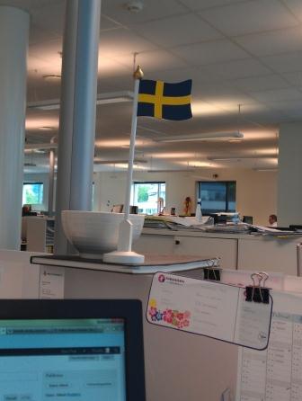 Igår var det som bekant den svenska nationaldagen, vilket uppmärksammades av förvånansvärt många här på jobbet. Det ströddes gratulationer över mig från höger och vänster, och den svenska flaggan som jag normalt har nere på skrivbordet lite halvt bakom skärmen hade av mina kolleger höjts upp över huvudet på oss alla och bredvid godisskålen.