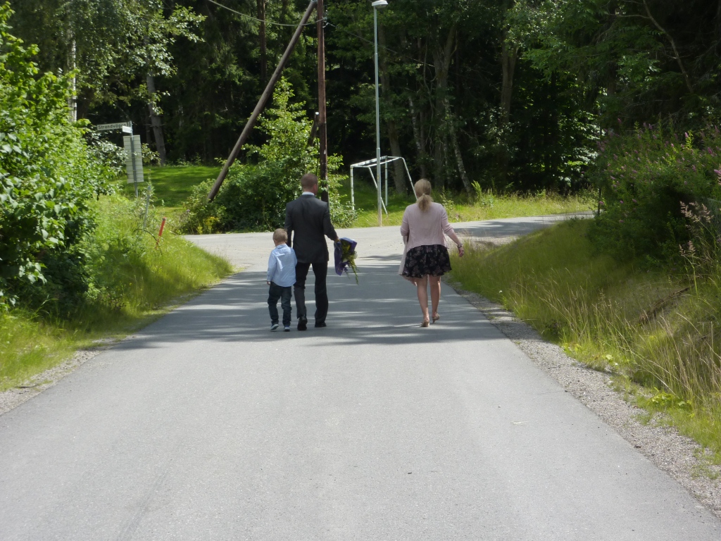 Lång historia kort parkerade vi hos vigselförättaren Anna och gick på given signal med henne ner till Alex och Jonas’ hus.