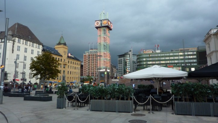 Det har varit underbart varmt och soligt väder precis hela dagen idag, men framåt kvällen började det torna upp sig svarta moln över himlen, och när jag kom ner till Jernbanetorget vid halv nio såg det ut så här