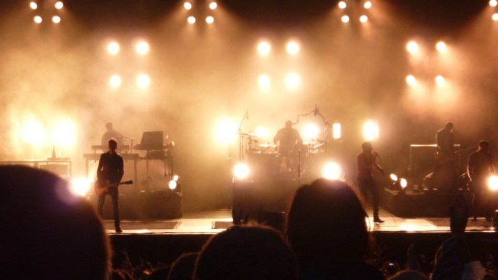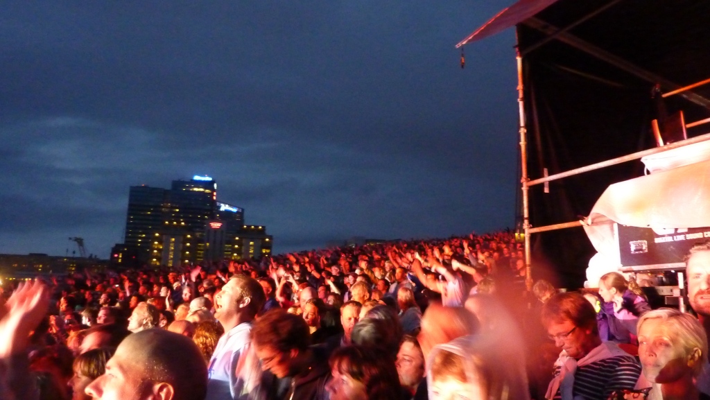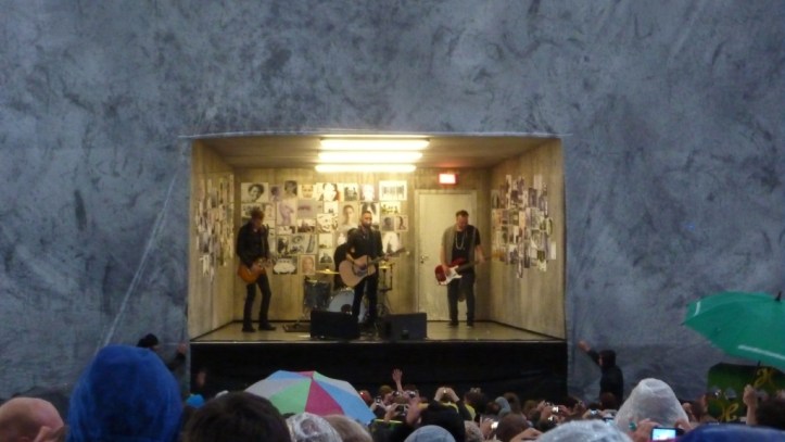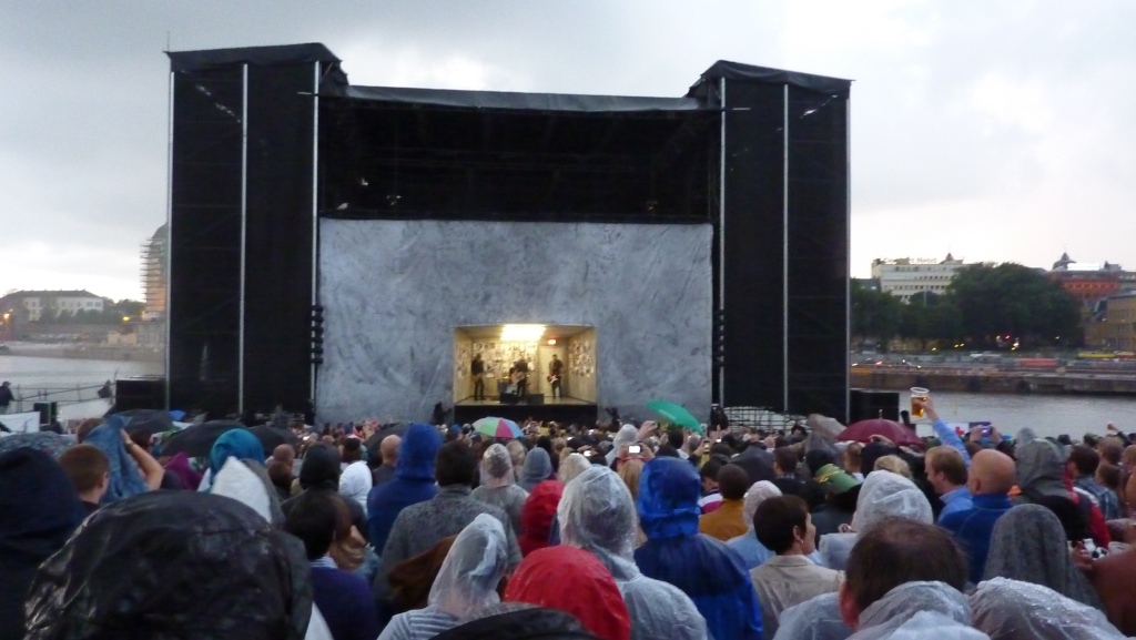 Inte mycket att be för (inte för att det hade hjälpt heller), bara att hiva sig på’t. Sen tog dom mitt paraply i ingången också, så då var ju allt förberett för en våt kväll. Regnet började falla sakta med stora stora droppar precis när jag kommit in på ”arenan”, men inget att göra. Fick en bra plats rakt nedanför mixerbåset, vilket jag tycker borde vara en bra plats att stå på eftersom de som sköter ljudet sitter i stort sett där och det således borde vara bäst just där.