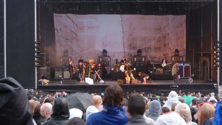 Faktum är att det var ett sånt skyfall att i första mellanrummet mellan låtar när scenen blivit ”vanlig” igen, kom det ut en armé av svartklädda roddare utstyrda med moppar, trasor, gummiskrapor och gaffatejp. Moppningen gick rätt fort och skrapningen därefter (ut med det i det lilla utrymmet mellan scenen och kravallstaketet bara, ingen märker ändå om det skvätter lite…), men sen höll dom på i tror jag två låtar och tejpade fast de mattor som låg på scenen.