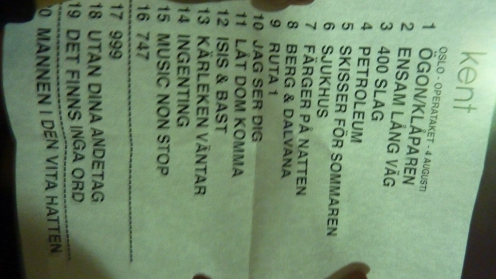 Låtvalet var okej, inte supertoppen. Lite för många från den nya (som alltid, man har inte hunnit vänja sig) och lite för få nittitalslåtar. Det är trots allt FF och Musik Non Stop som spelas mest på radion här när det gäller Kent.