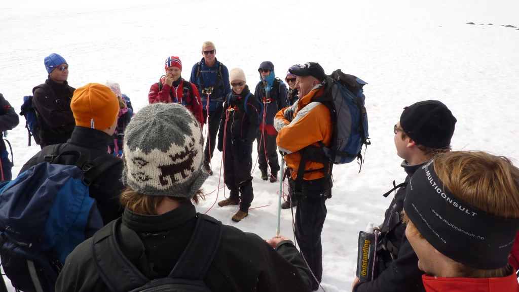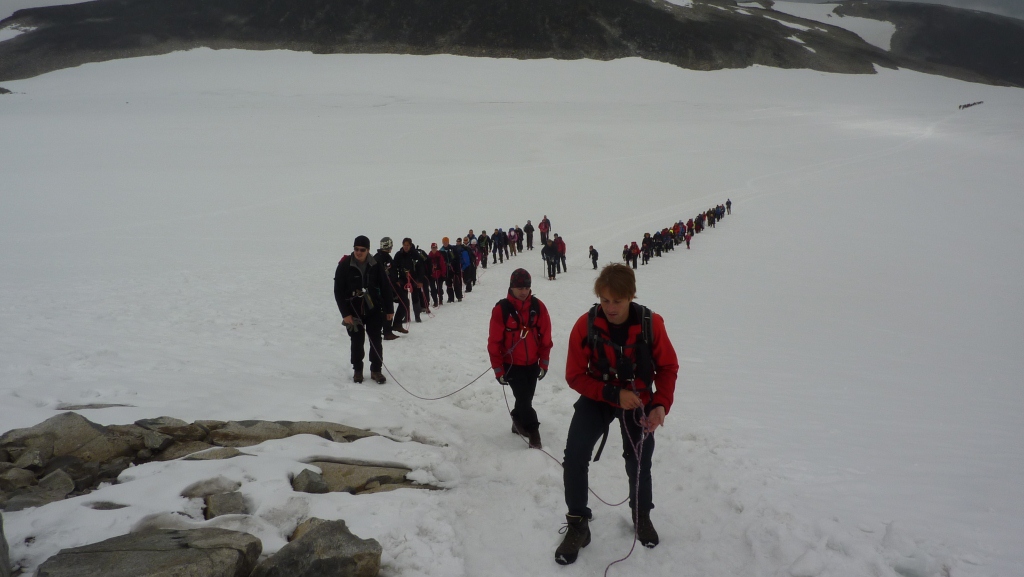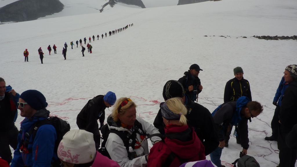 Högre upp är det en glaciär som man kryssar. För mig som är helt okunnig om naturens faror ser der bara ut som snö, men det är det naturligtvis inte. Det bildas bäckar under, det smälter och blir urholkat och det kan brista. Så då bildar man replag så att den som eventuellt trilla ner inte ska bli helt ensam där nere, utan dra med sig några fler så de har något att fördriva tiden med när de väntar på att resten av replaget ska dra upp dem.
