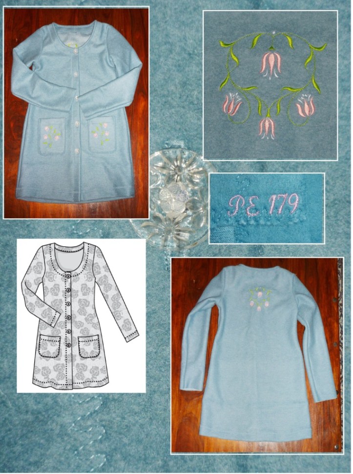 Syprojekt nr 179; ullcardigan, stor och lös i formen med gulliga blomsterbroderier på rygg och fickor.