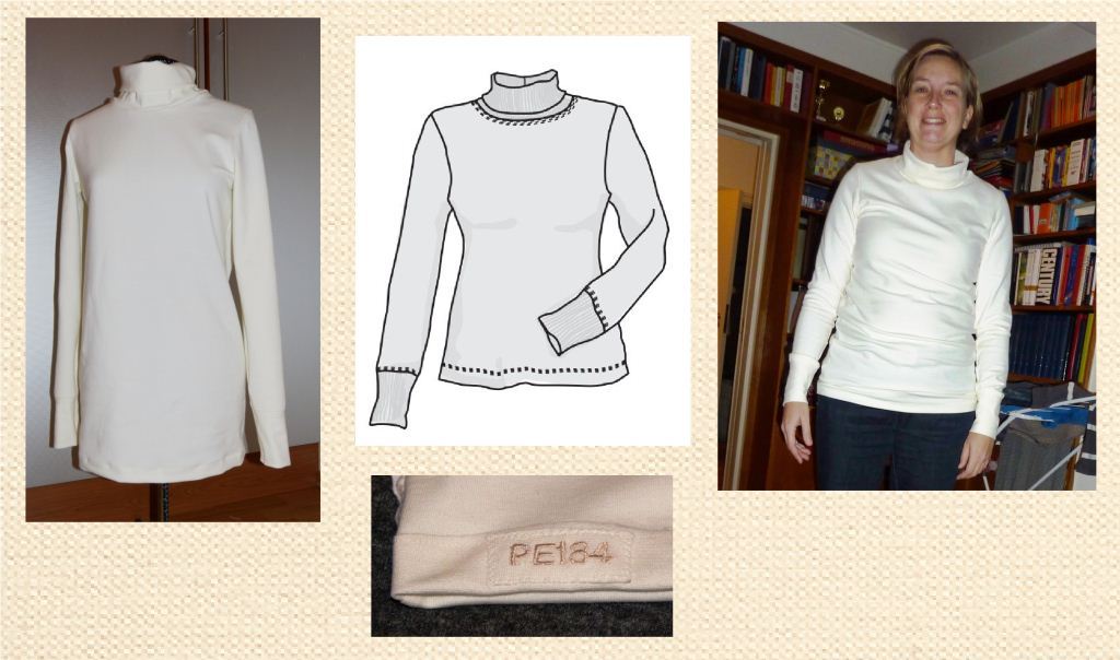 Alltför liten storlek; tyget förväntas krympa 8% så det är tilltaget stora marginaler och gjort strl 44. Ändå sitter den som en 42’a innan den är tvättad, så det här är enda gången den kommer att sitta på mig. Sen måste jag ge bort den till någon som är smalare än jag och så göra mig en ny i större storlek som sen kan krympa ner till att bli lagom. Tur att tyget är billigt och att det går fort att göra.