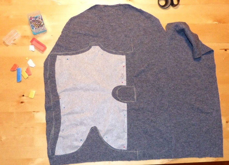 Ulltyger = slut -> ta fram de gamla tröjorna från O som utgör banken av stickat ulltyg här i huset. Ta dessutom fram det gamla mönstret (som vi nu dessutom vet är lite för litet) och måtta ut det på tyget. Om man ska brodera på tyget måste det vara lite större än färdigklippt för att man ska kunna spänna fast det i ramen och sätta in det i maskinen.