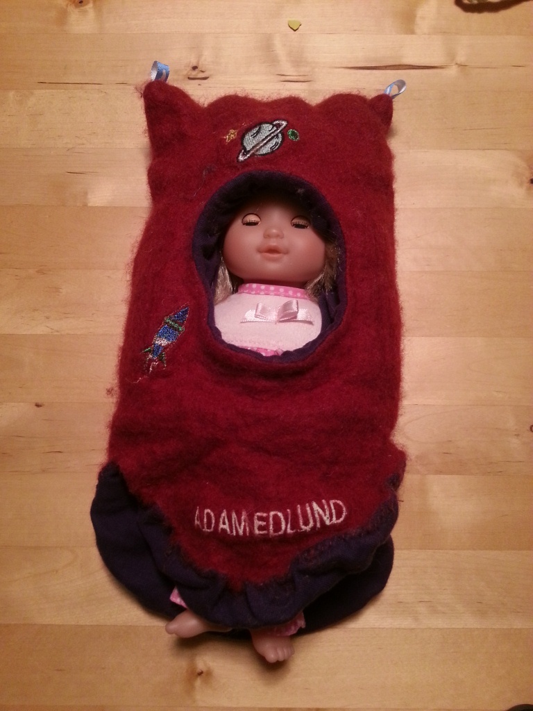 någon (rent hypotetiskt) eventuellt skulle ha tvättat den och den hade krympt så den helt plötsligt var lagom som sovsäck till en liten docka…då får den som tabbat sig ta sig tiden att göra OM halsluen, annars… Och helst bättre med en rymdman på, och inte bara planeter.
