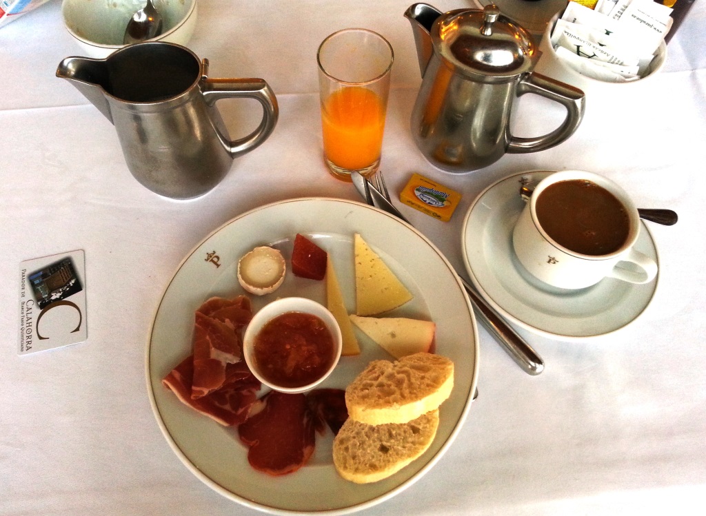 Himmelskt god getost, en bit manchego, en annan ost och lite skinka och salami. I mitten en tomatconcassé av något slag, och en liten marmeladklump som gick perfekt ihop med osten. Bara tänk bort marmeladen och det vita brödet så har vi LCHF, jodå. Och kaffet är trögflytande och svart, precis som det ska vara. Bättre än det italienska kaffet (sticker ut huvudet och duckar för slagen)