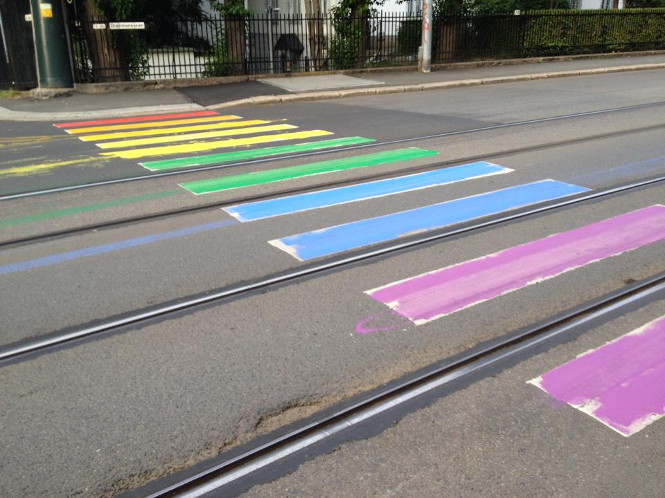 ….när maken gick förbi i morse var det festligare än när jag gick häromdagen. Riktig färg den här gången, inte bara tavelkrita.