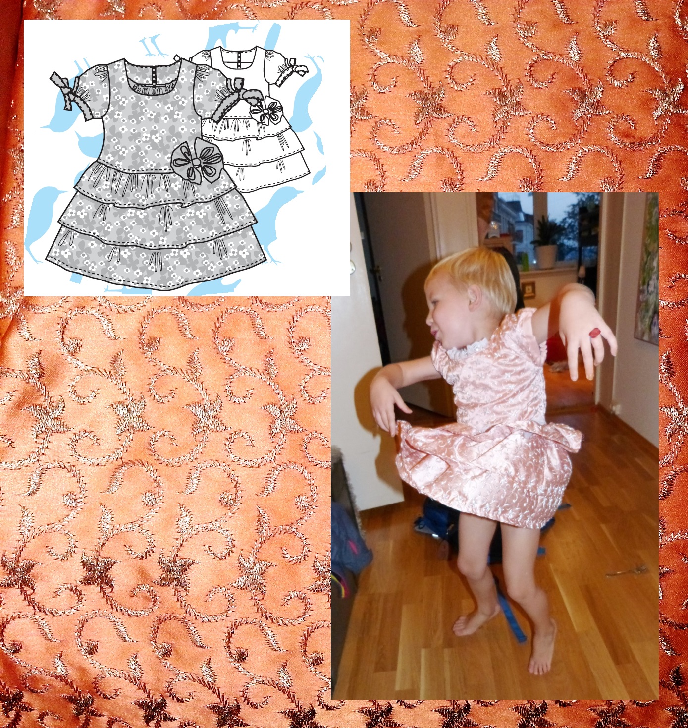 För nu är syprojekt 199 färdigt! Mönstret är Ottobre nr 6-2009 med modifieringar på ärmen, dvs ingen knytärm med rosett, och heller ingen rosett i sidan. Istället satte vi ett strassklätt spetsband i halsringningen och samma i midjan.