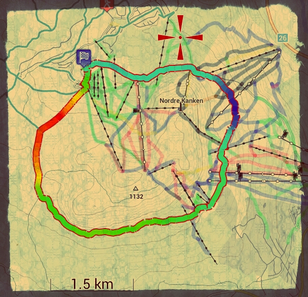 Men så den riktiga kartan över spåren runt fjället: Dryga elva kilometer var spår 10, sen 3 sen 4. Det som är märkt med 5 på kartan var 3 i verkligheten, eller så såg jag fel.