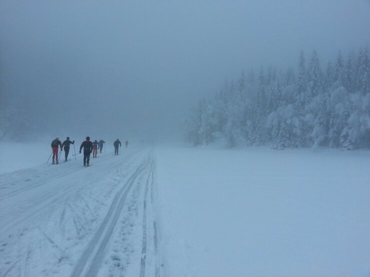 Men det var vackert! Ett tag. För sen när man kom ner några höjdmeter var dimman tät och permanent, och den blev tjockare och tjockare, och snön blev klibbigare och klibbigare.