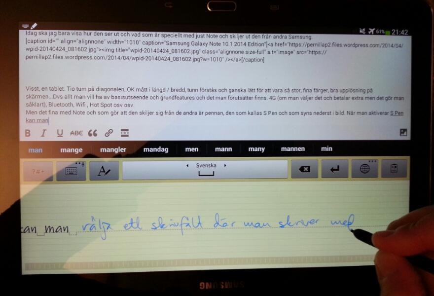 Men det fina med Note och som gör att den skiljer sig från de andra är pennan, den som kallas S Pen och som syns nederst i bild. När man aktiverar S Pen kan man välja ett skrivfält där man skriver med sin vanliga handstil som kommer in som text. Sen jag började med det har jag knappt använt det vanliga tangentbordet som är på skärmen.