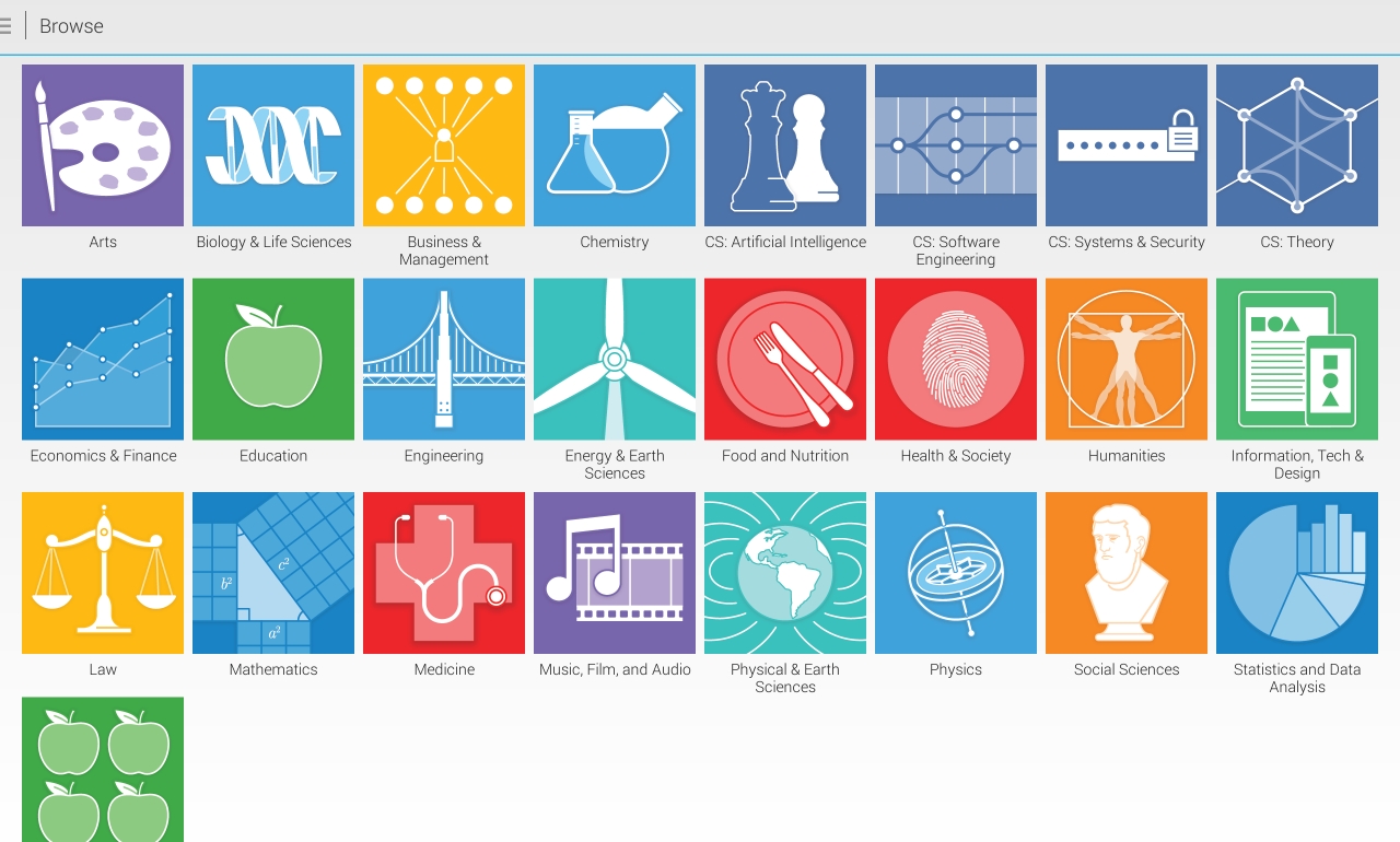 Det är inordnat efter ämnen och ganska brett som synes. och universiteten som ger kurserna är kända; Harvard, Stanford, MIT, Johns Hopkins, Princeton, men även för mig helt okända.