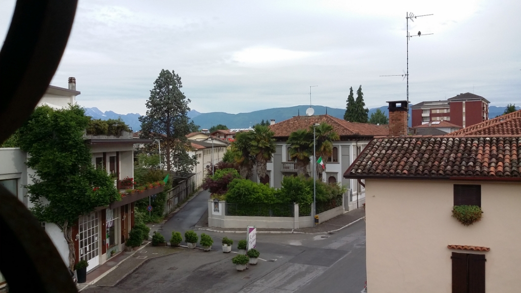 I morse kunde jag inte sova, så jag gick ut och tog en promenad runt den lilla lilla stan. Sådär fin och italiensk som man föreställer sig; låga hus, järnsmidesbalkonger, terrakottafärgade hus, tegeltak, små växter och pelargoner överallt, och så bergen som ruvar i fjärran. Alperna.