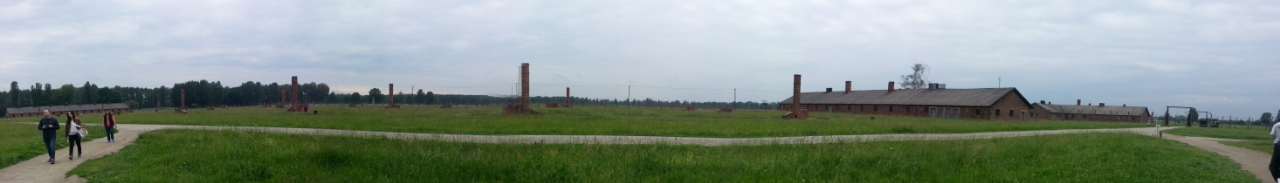 Se hur jävla stort Birkenau är. Varje skorsten motsvarar en träbyggnad som inte finns längre men som huserat många hundra människor, och raden av skorstenar bara pågår i det oändliga. Hundra tusen personer bodde här samtidigt, och det går inte att föreställa sig.
