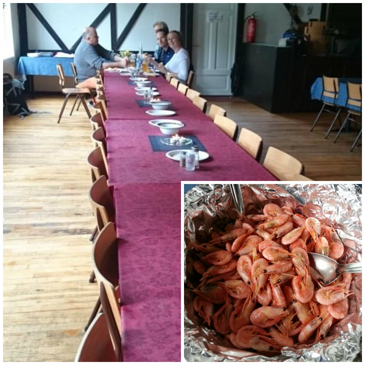 Att ha mat som man äter med händerna (räkor) och tar från buffen med händerna (brödet och citronklyftorna) men ett utedass där man inte kan tvätta dessa händer som man sen är och gräver med i skålarna…Nä, där tar det stopp för mig. Särskilt när det är 30 pers som är och gräver i samma skålar.