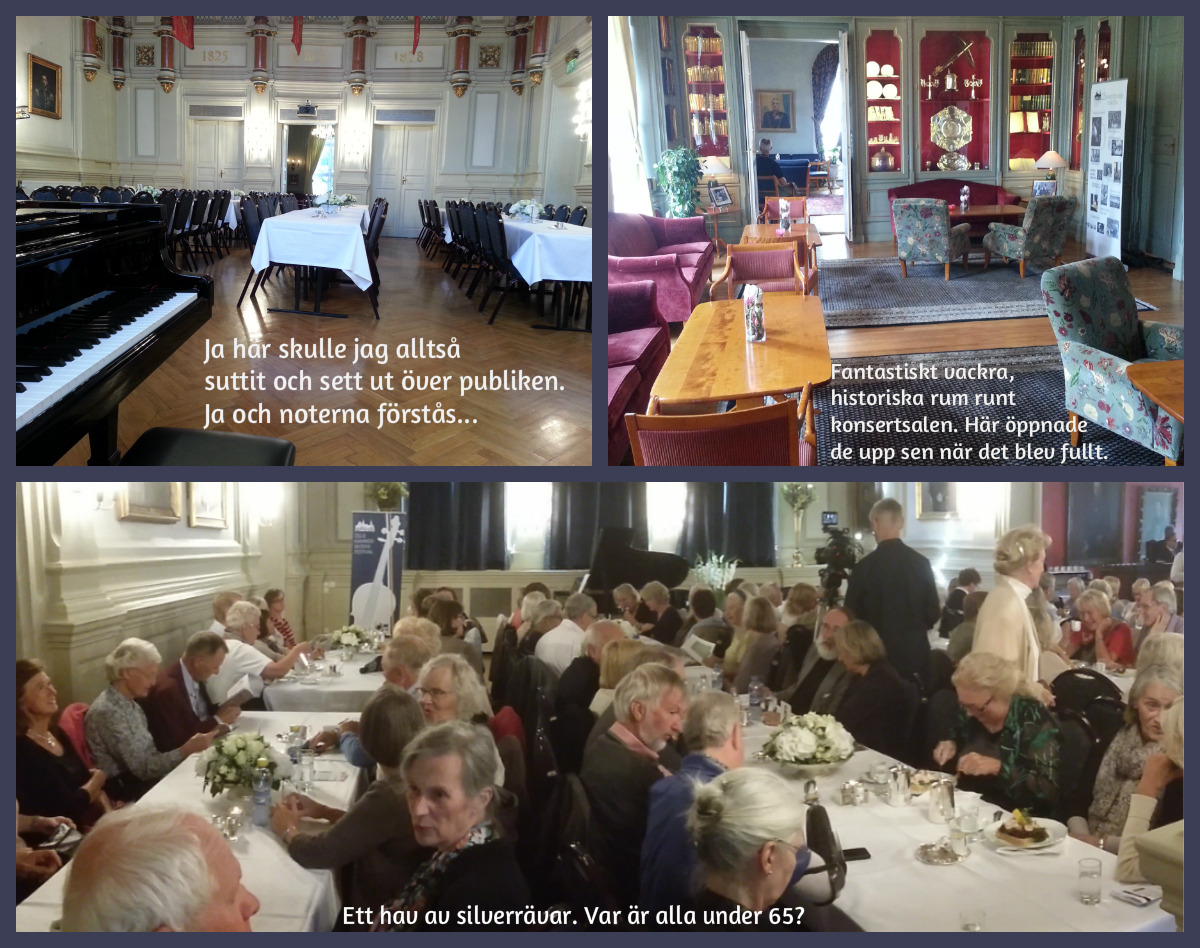 Det var en ganska liten konsertsal, bara drygt 90 personer fick plats eftersom alla skulle sitta vid bord och äta lunch, plus att det här var Arve Tellefsens enda framträdande som musiker under festivalen. Ergo var det proppfullt och dom fick öppna upp till soffområdet utanför själva salen. Fint med mycket folk tycker jag; hellre proppfullt i en liten lokal än ödsligt i en stor.
