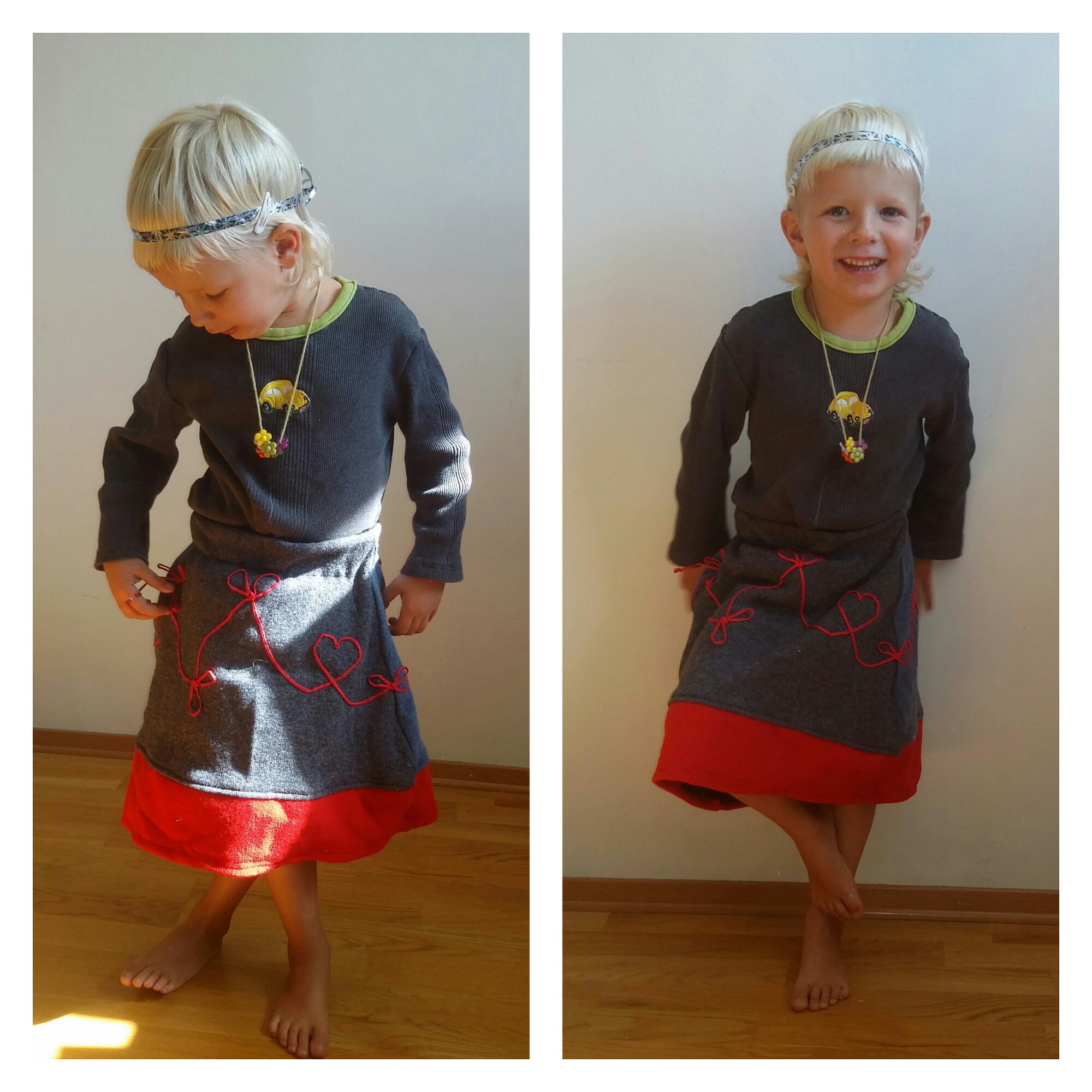 Det var ett tag sen killarna vara så små att det gick att få ut en varm och go barntröja ur en avlagd eller trasig vuxentröja. Men därmed inte sagt att det är helt kört med re-make. Jag blev häromdagen tvungen att rensa i tyglådorna (!) och då rök bland annat en del gamla slamsor som jag sparat i ”bra-att-ha-andan”. Men när jag såg lite närmare på några avklippta ärmar och höll dom upp och ned såg jag att en avklippt vuxenärm från en ullcardigan är till förväxling lik ett fram- eller bakstycke på en enkel barnkjol.