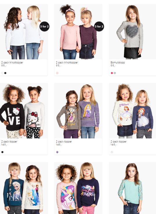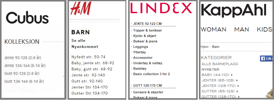 Så här ser det ut på hemsidorna till de stora klädaffärerna där jag tror de flesta föräldrar köper en stor del av kläderna till sina barn, bland annat vi: