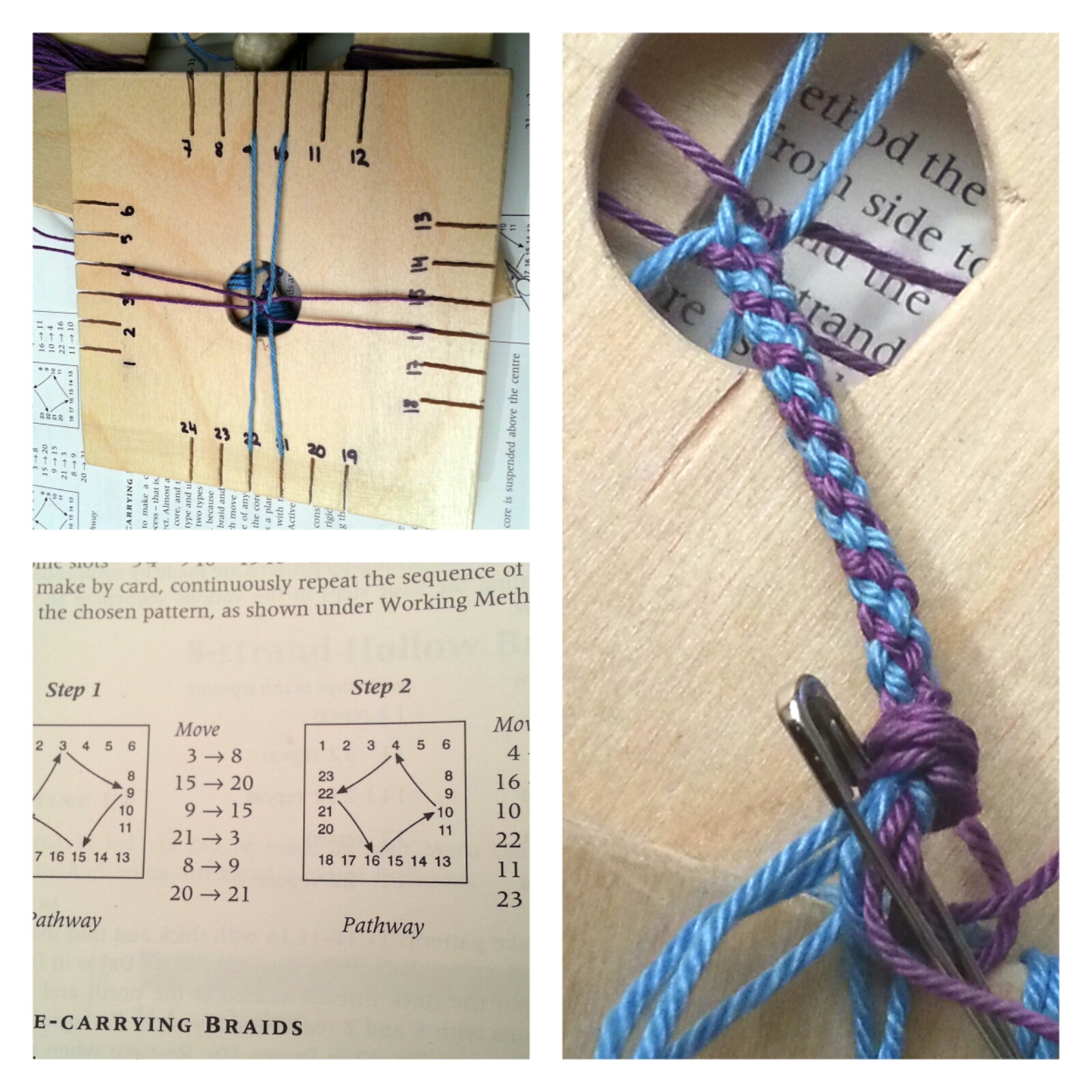 Så fram med boken och det lilla kortet jag har gjort av en söndersågad trämapp från IKEA där runt 2001 någon gång, garn (bomull, har inte vågat ge mig på silke än) och så börja knåpa. Ett enkelt spiralband med åtta trådar i två färger; lila och ljusblått. Målet är att en dag göra det där blå och vita spiralbandet i mitten av bokomslaget, men det dröjer eventuellt ett liiiiitet tag till.
