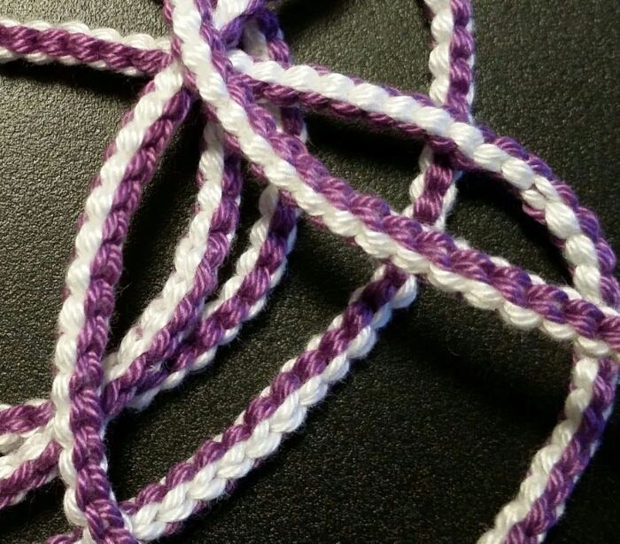 Och som om inte det var nog avslutade jag mitt första band jag gjort på väldigt länge. Efter att jag byggde min hemmagjorda Maru Dai av lite kartong, en hink och några blompinnar gick farten upp betydligt i flätandet, så numera finns det ca 50 cm lila och vitt handflätat bomulssnöre att tillgå för den som har behov.