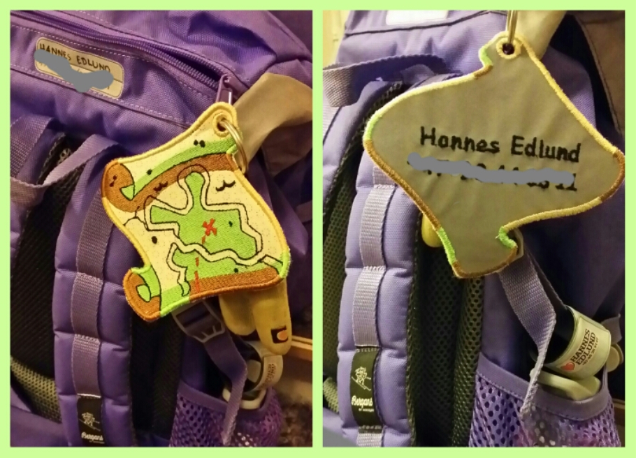 Men igår kom ett litet hälsotecken. Jag sydde två namnlappar till kidsen – skattkarta på framsidan och reflextyg på baksidan. Och det var himla kul! Två timmar per styck tog det och det var inte ens jobbigt.