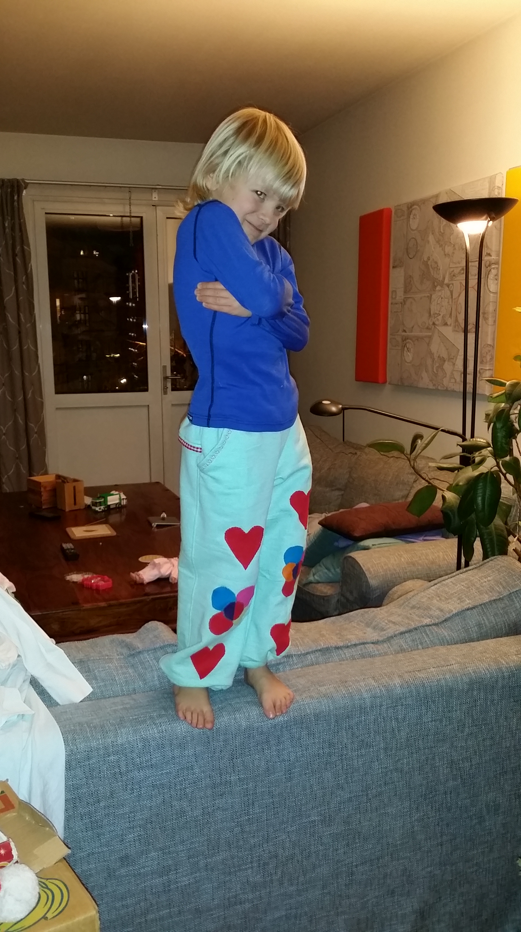 Så Hannes ville också ha mjukisbyxor i samma tyg, vilket var bra för det fanns mycket och han behövde ett par.