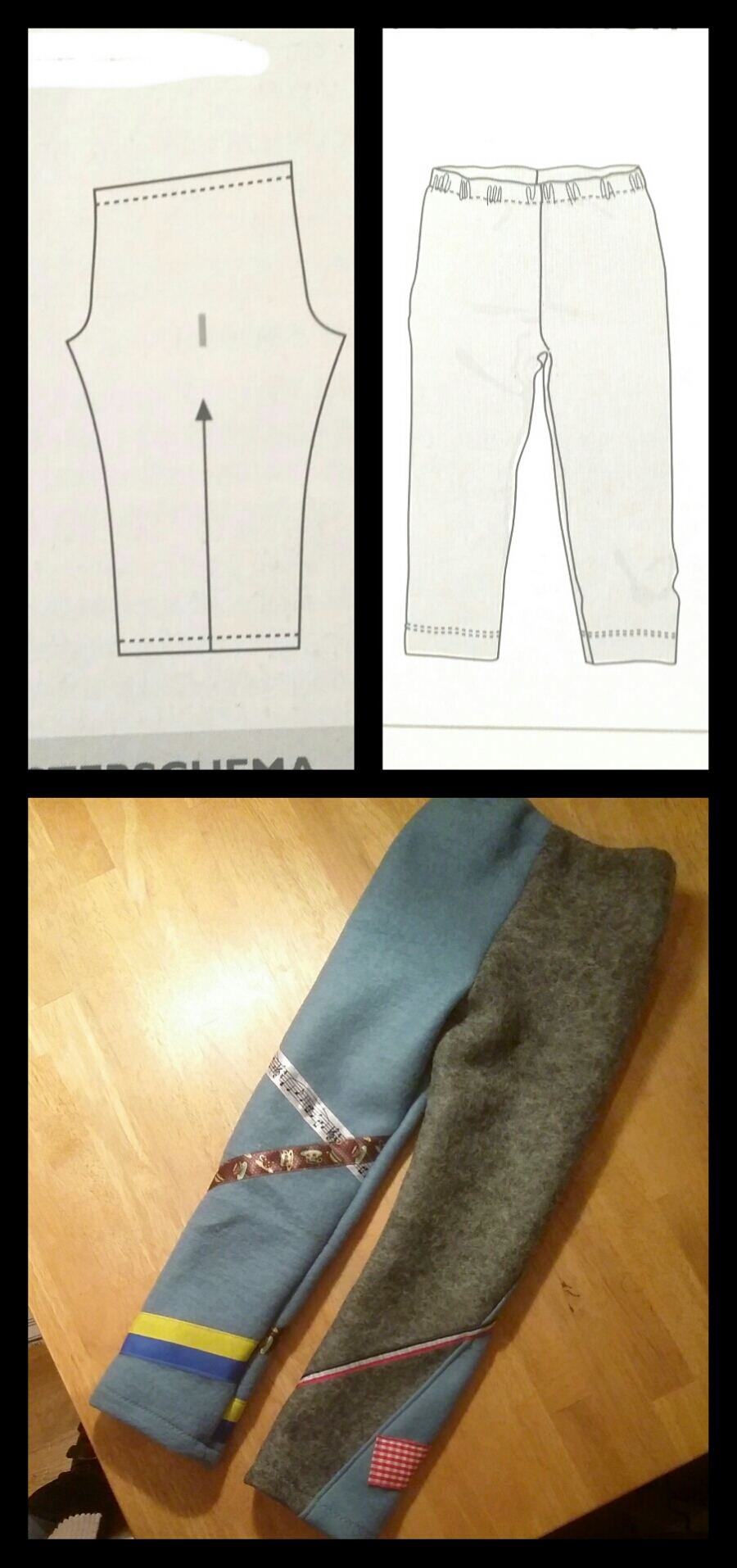 Just den här gången var det inte leggings som var aktuellt för vår del men tjockare byxor i ulltyg att ha utanpå långkalsongerna men under täckbyxorna. Om man ska göra av ett sånt tyg måste man göra benen lite vidare och ändra linjen från grenen och nedåt till att bli lite rakare. Annars helt likt.