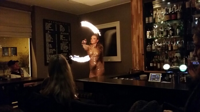 På vägen hem gick vi förbi Barotto för att avrunda med en pilsner. Jag är inte säker på vad man ska lägga för innebörd i det hela (med all sannolikhet överhuvud taget ingen alls), men nog är det lite komiskt att det just den kvällen var en förförisk kvinna i m e g e t tight guldpaljettfodral som hade en liten show där hon jonglerade med eld och med bravur visade hur smidig och rörlig hon var. Till publikens glädje förstås. Tills andra showen gick på och den var i stort sett identisk med den första (varje show var ca 4 minuter lång) med samma rörelser och i ungefär samma ordning. Jag tror att hon hade vunnit på att ta in en koreograf och fått lite hjälp, för hon kan få det att bli något.