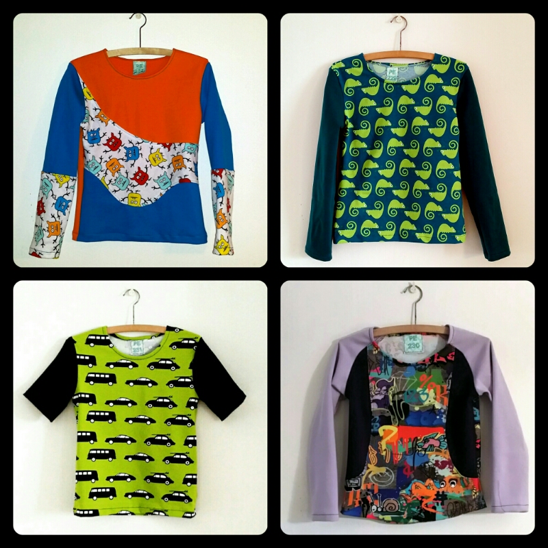 De tre första, monster, kameleonter och bilar, är alla samma mönster – Ottobre Creative Workshop 301. Vissa modifikationer gjorda – kort ärm säger sig självt, men för att göra den första med monstren måste man klippa isär framstycket i någon form man gillar.