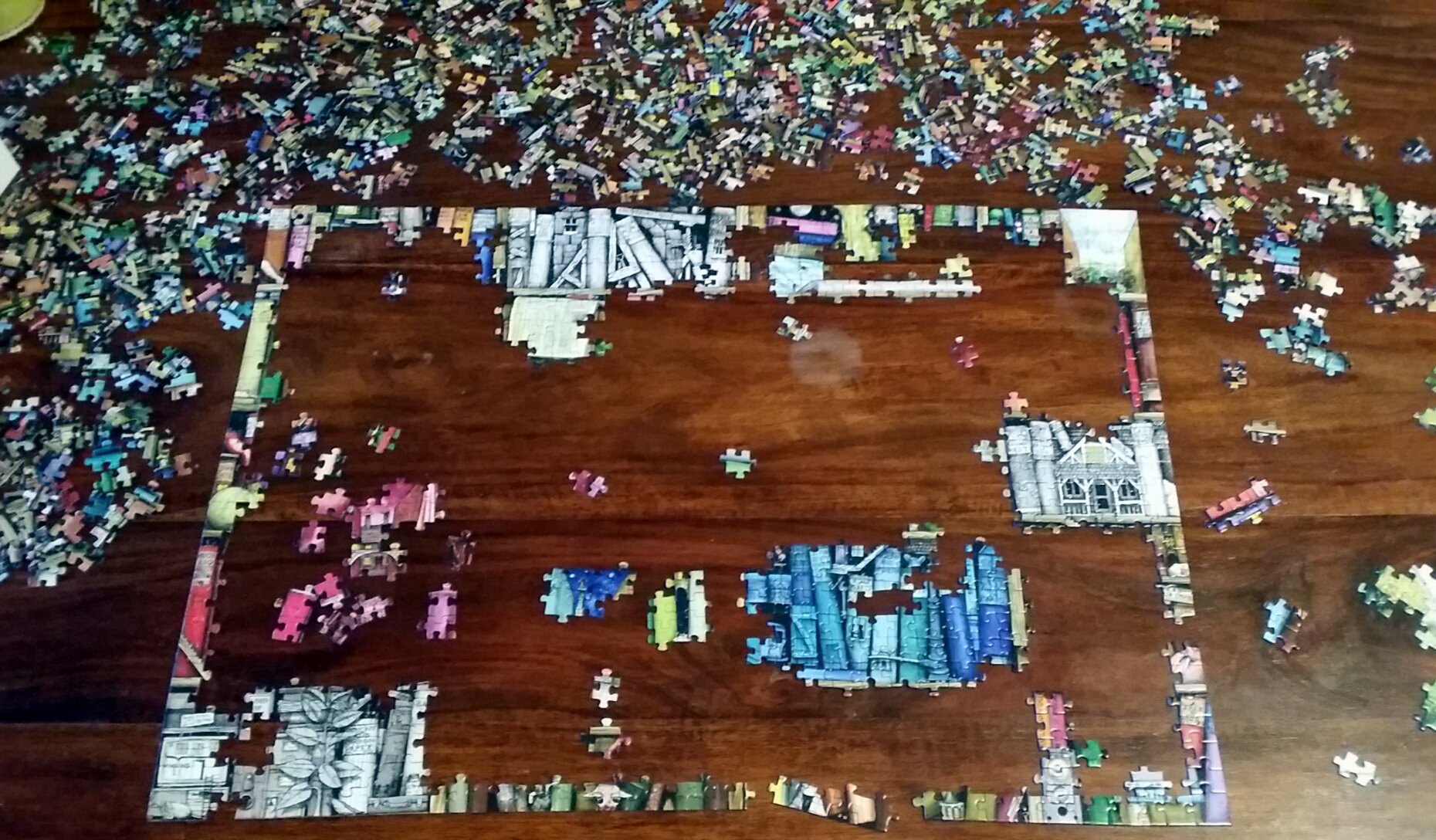 Jag köpte pussel till mig och barnen för ett tag sen. Dom fick 150 bitar och jag fick 1000, och en kväll blev det dags att lägga mitt pussel. Jag hade tänkt att jag första kvällen skulle hinna vända bitarna och kanske hitta några kantbitar, men efter några timmar när det var läggdags hade jag kommit så här långt: