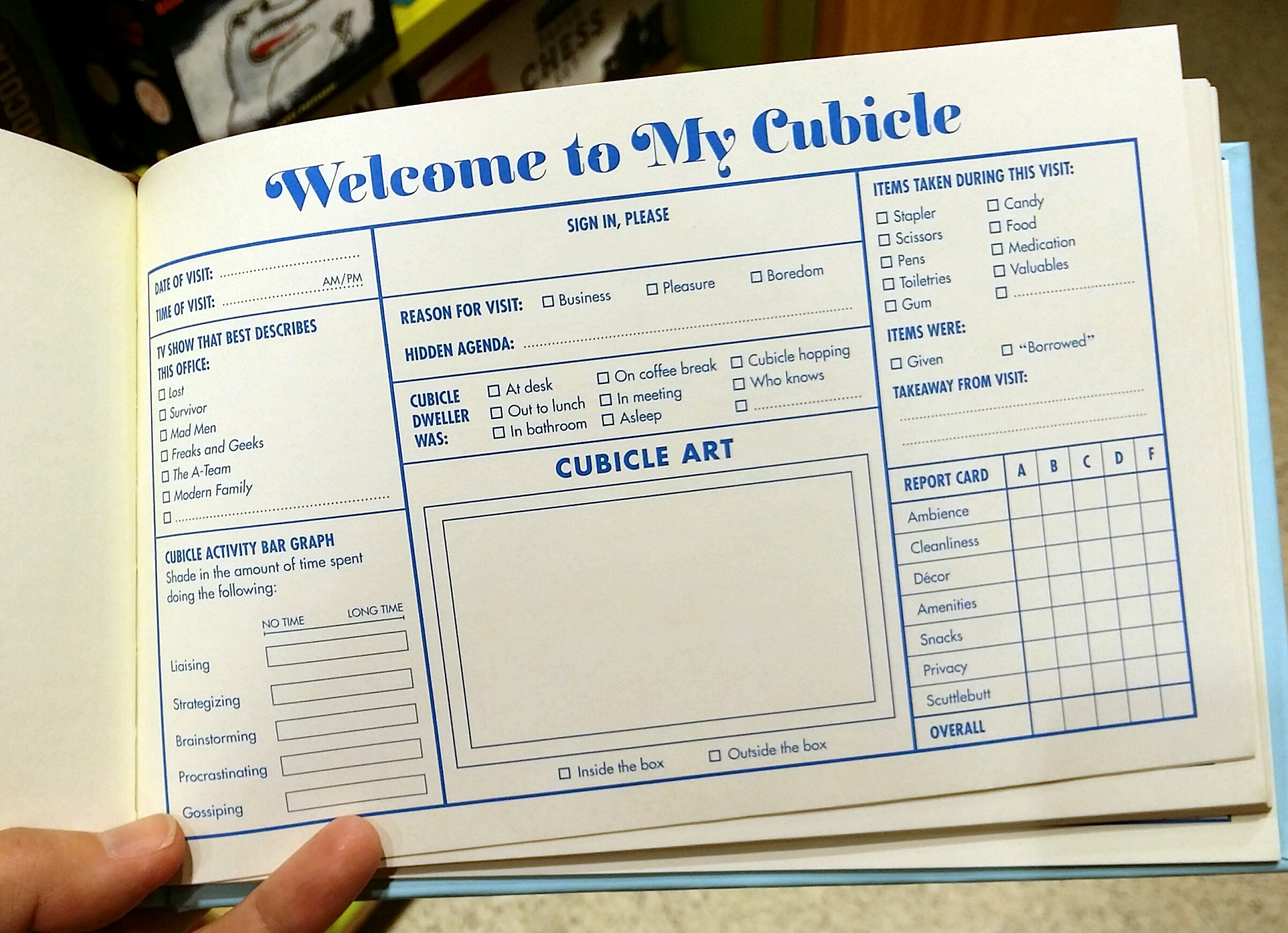Den hade en massa skojiga sidor i sig för gästerna att fylla i när dom kommer till ett tomt skrivbord. Till exempel det här