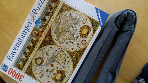 Så är det här. Det nya pusslet och (eftersom även pussel är en materialsport) pusselmattan. En matta som förbättrar ergonomin för pusslaren och ger bättre glid för handen. Och så givetvis en indoor holemaker.