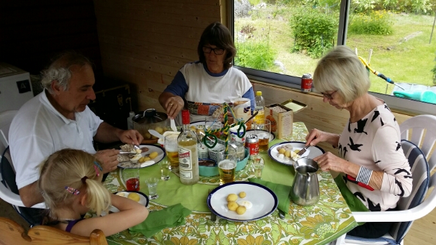 Sill och nubbe till lunch och grillat till middag, som det ska vara. Solsken genom molnen i några timmar, regn lite senare men vem bryr sig. Det är ändå aldrig varmt och vackert på midsommar så det är inget att låtsas över, men istället njuta det som är. Och det har jag gjort – kvällen avslutades med mammas Pavlova. Den bästa i världen, yum…