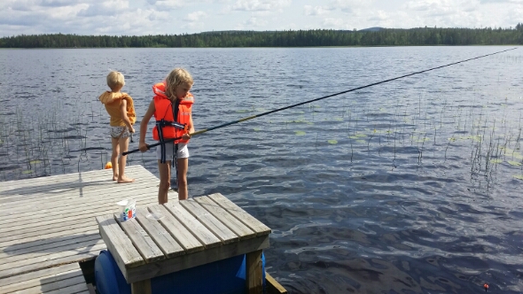 Vi är någonstans där barnen kan gå ner till sjön själva med sina kusiner och fiska. Det har några goda saker med sig; Adam får fiska hela tiden och vi vuxna slipper 1) Tjatet om ”Kan vi inte fiska?” och 2) Fiska. Dvs alla är lyckliga.