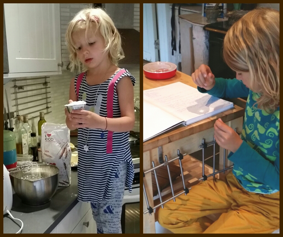 Lyckligtvis för mig har jag barn som gillar att vara med i köket och hjälpa till, och kakor är tacksamt. De är målfokuserade (kakor, KAKOR!!! Är det färdigt snart??!!) och aktiva med både att blanda och att slicka skålar. Häromdagen gjorde vi sockerkaka som vi modifierade med lite kakao, grovhackad choklad och mashmallows (som smälte, så gör inte det).