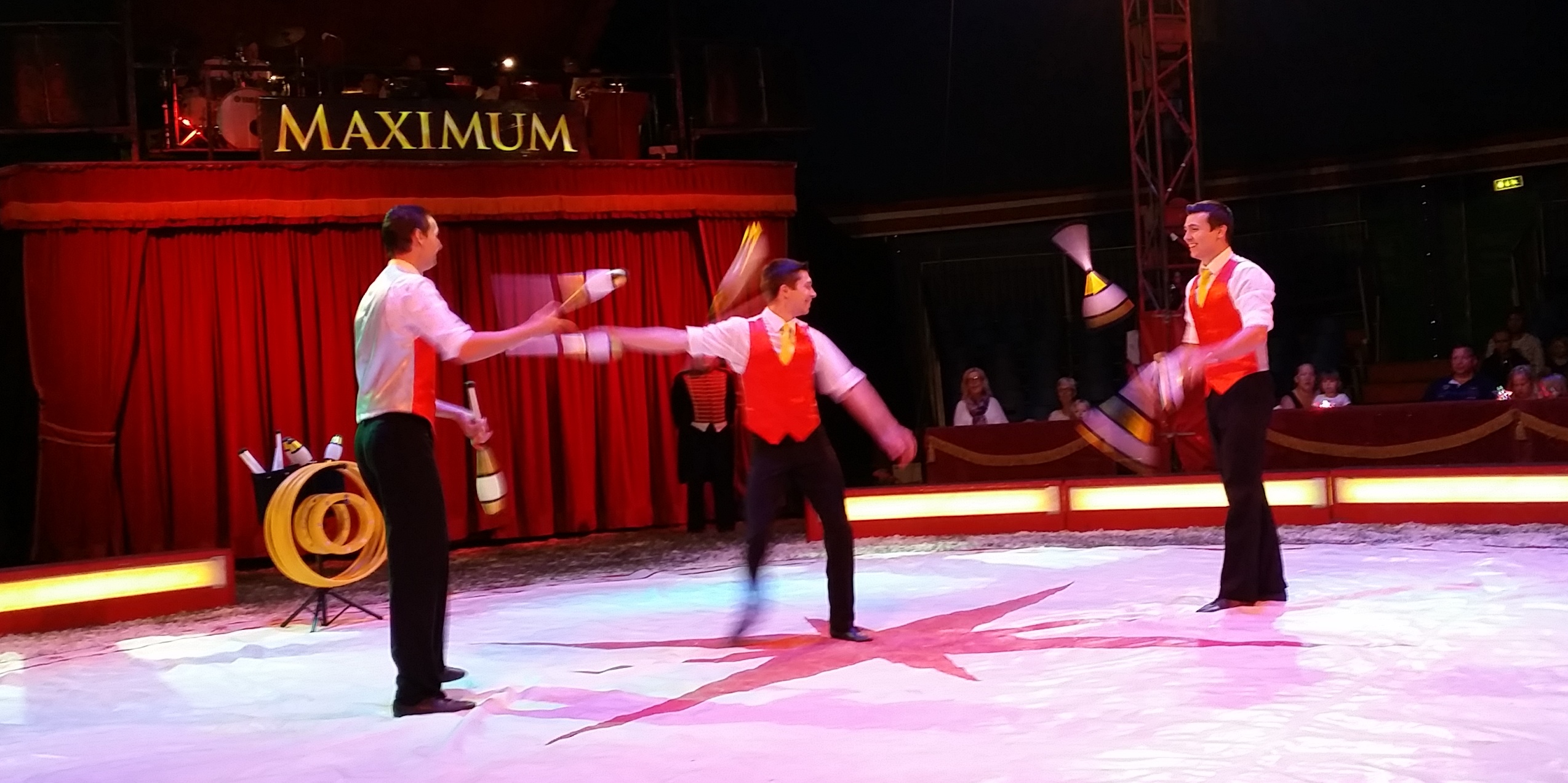 Och det var som cirkus förväntas vara, fast i princip utan djur då. Inga tigrar eller elefanter (förutom en som man kunde se på i pausen om man betalade en slant extra och stod i kö en liten stund, precis som kamelerna man kunde rida på för en slant och en lång kö), men väl en massa konstfärdiga akrobater. Först ut var det här gänget, Trio Sarkozi, från Ungern. Grymt skickliga på att jonglera, kasta, fånga och bra showmen också. H var helt betagen av deras trixande.