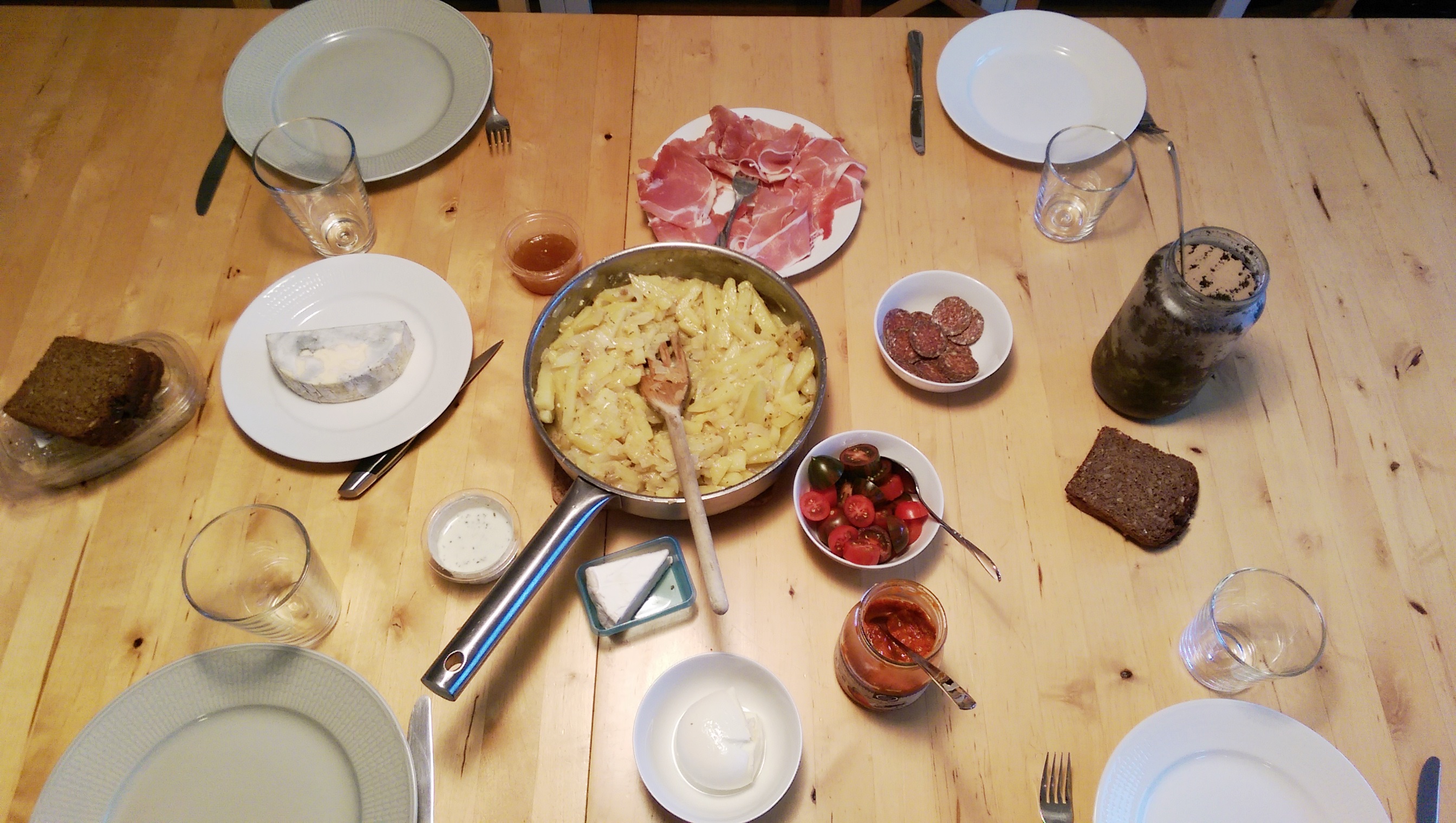 Men häromdagen tröttnade jag och grävde ur det som var där inne och ställde ut på bordet. Som bas tog jag några potatisar och lite lök och stekte upp för att ha något varmt, och det blev en helt fantastisk måltid på bara en halvtimme: