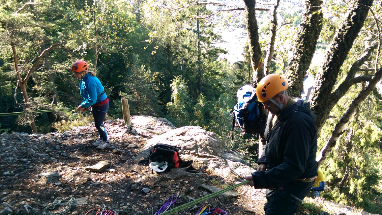 Efter en matbit var det dags för del två – rappellering och flytta rep medan man hänger i väggen. Det heter naturligtvis något annat, typ ankarfäste för topprep eller liknande, men poängen är att man först firar sig ner med repet runt ett träd, sen säkrar sig i bultar som finns i väggen (som någon vänlig själ har monterat en gång i tiden), bygger upp ett nytt fäste för repet i de bultarna och sen flyttar repet från trädet (drar ner det helt enkelt) och fäster det i det nya fästet du just har upprättat. Skapat ett topprep, helt enkelt.