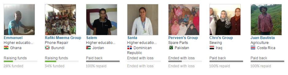 Man ska som alltid bara satsa det man har råd att förlora; Santa skulle läsa till läkare men blev själv sjuk en bra bit in och missade en kurs varpå hon inte fick lov att gå vidare med andra kurser. Perveen’s Group i Pakistan vet jag inte hur det går för, men Kiva-partnern i Pakistan som hanterar lånet betalar inte tillbaka in till Kiva och har blivit terminerade som partner. Varför vet jag inte och orkar inte tänka på heller. Hoppas det gått bra för Perveen’s Group som skulle ha lånet iallafall och att inte allt gått i fickan till Kiva-partnern.