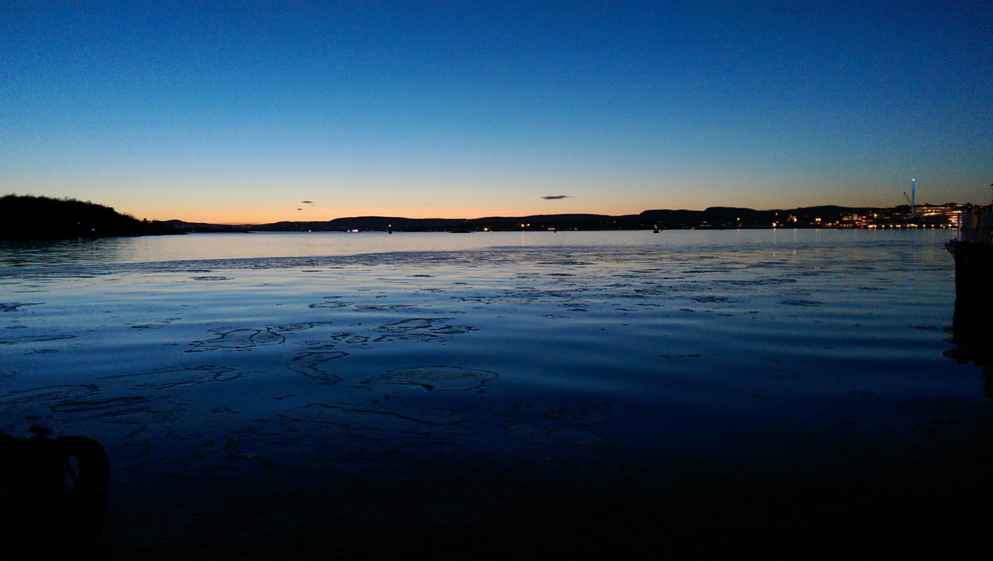 Det var kallt ute, men jag gick en sväng ut på Aker Brygge också och vidare ut på Tjuvholmen. Ju längre ut man kommer, desto tystare blir det. Färjorna ut till Asker glider förbi som tysta skuggor i mörkret, och någon enstaka person som är ute med sin hund går förbi på gräsmattan utanför Astrup Fearnley-museet. Så jag gick mig en tur i området, via en ren byggd av motorcykeldelar och andra mekaniska föremål där det var tänkt att jag skulle föreställa mig att det var en älg 🙂