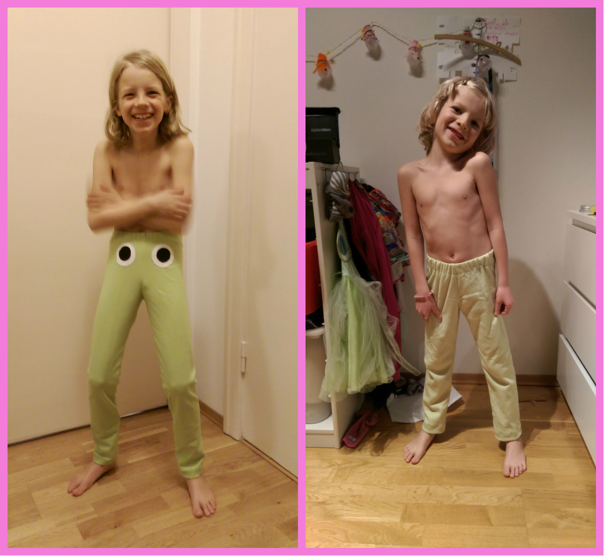 Ja barn kan visst aldrig få för många leggings. De tycker nämligen att de är så sköna att de har de varje dag och sliter något väldans på dom. Vilket ju är bra naturligtvis, kul att göra kläder som används. Och leggings går så otroligt lätt och fort att göra; ca 1 timme inklusive klippning, och har man tygerna hemma redan så är det ju inget att snacka om, bara gör.
