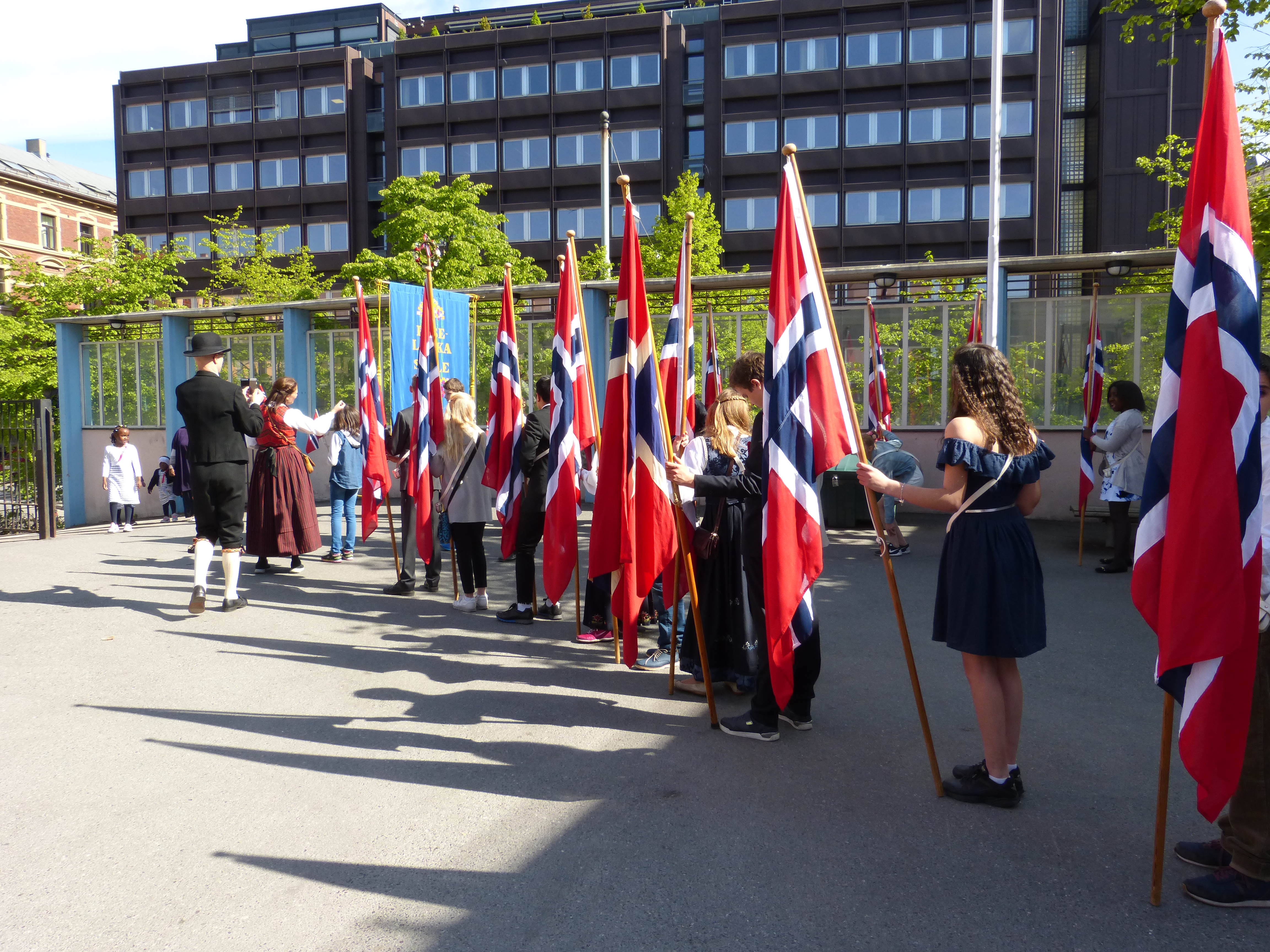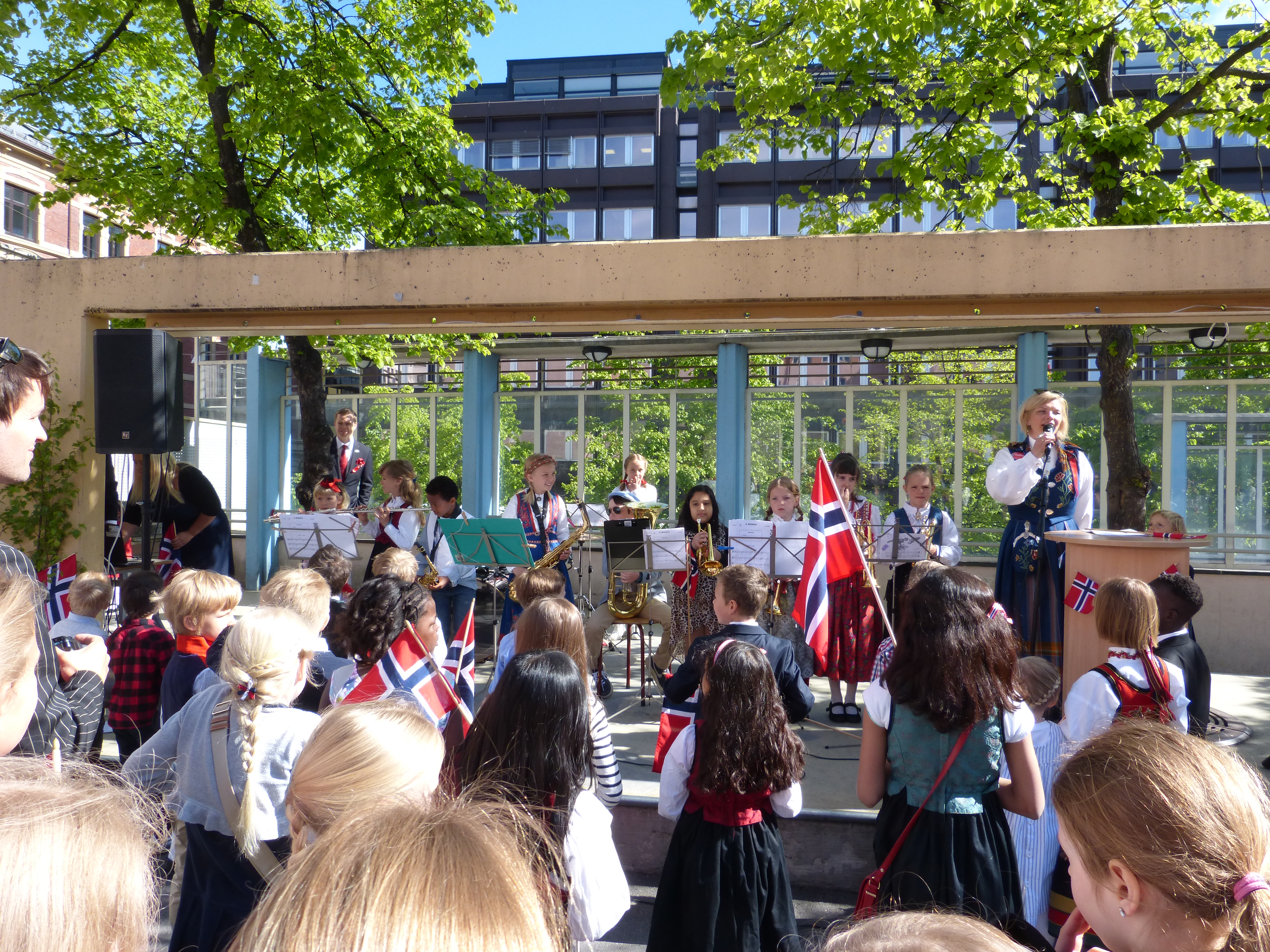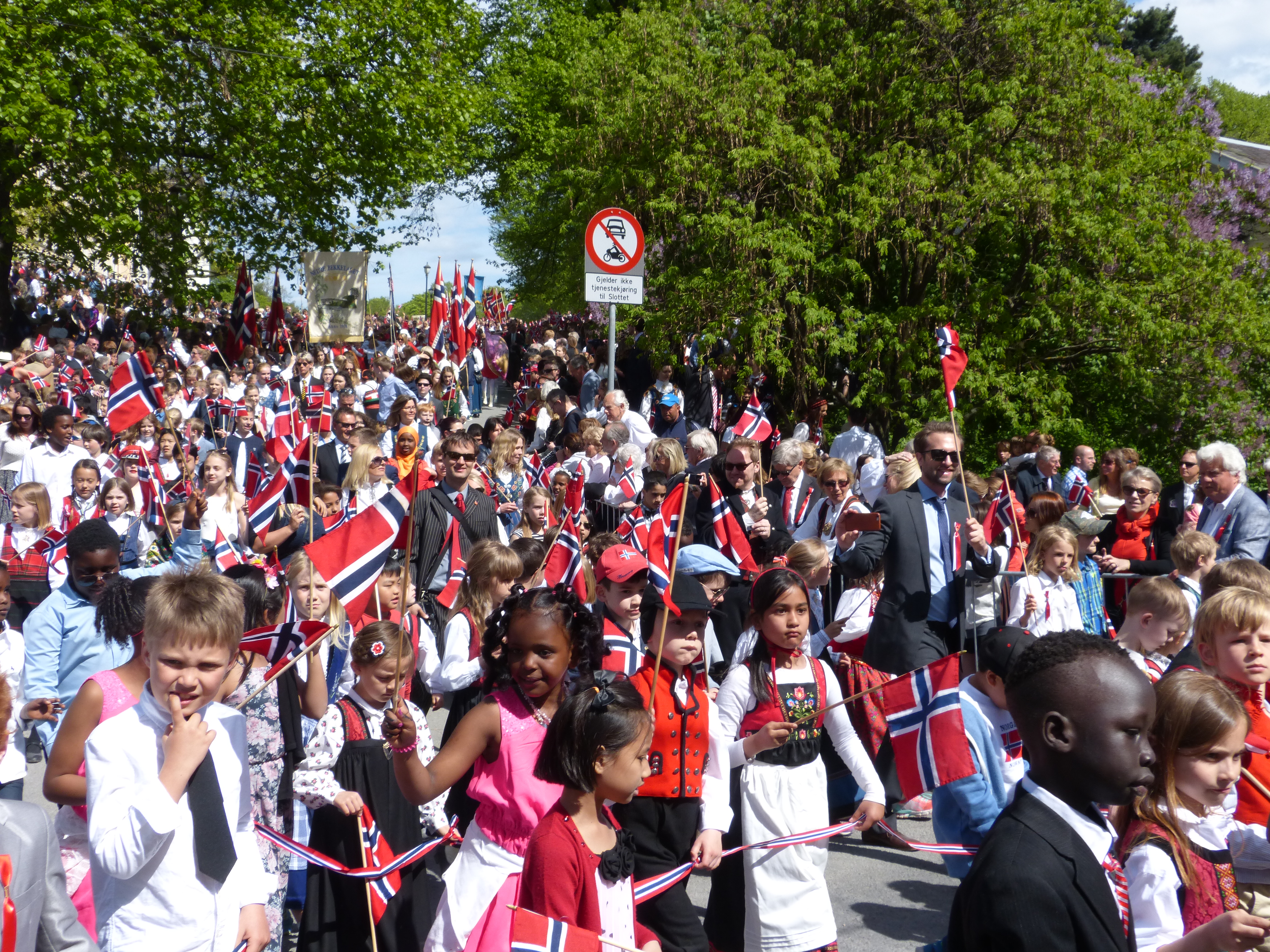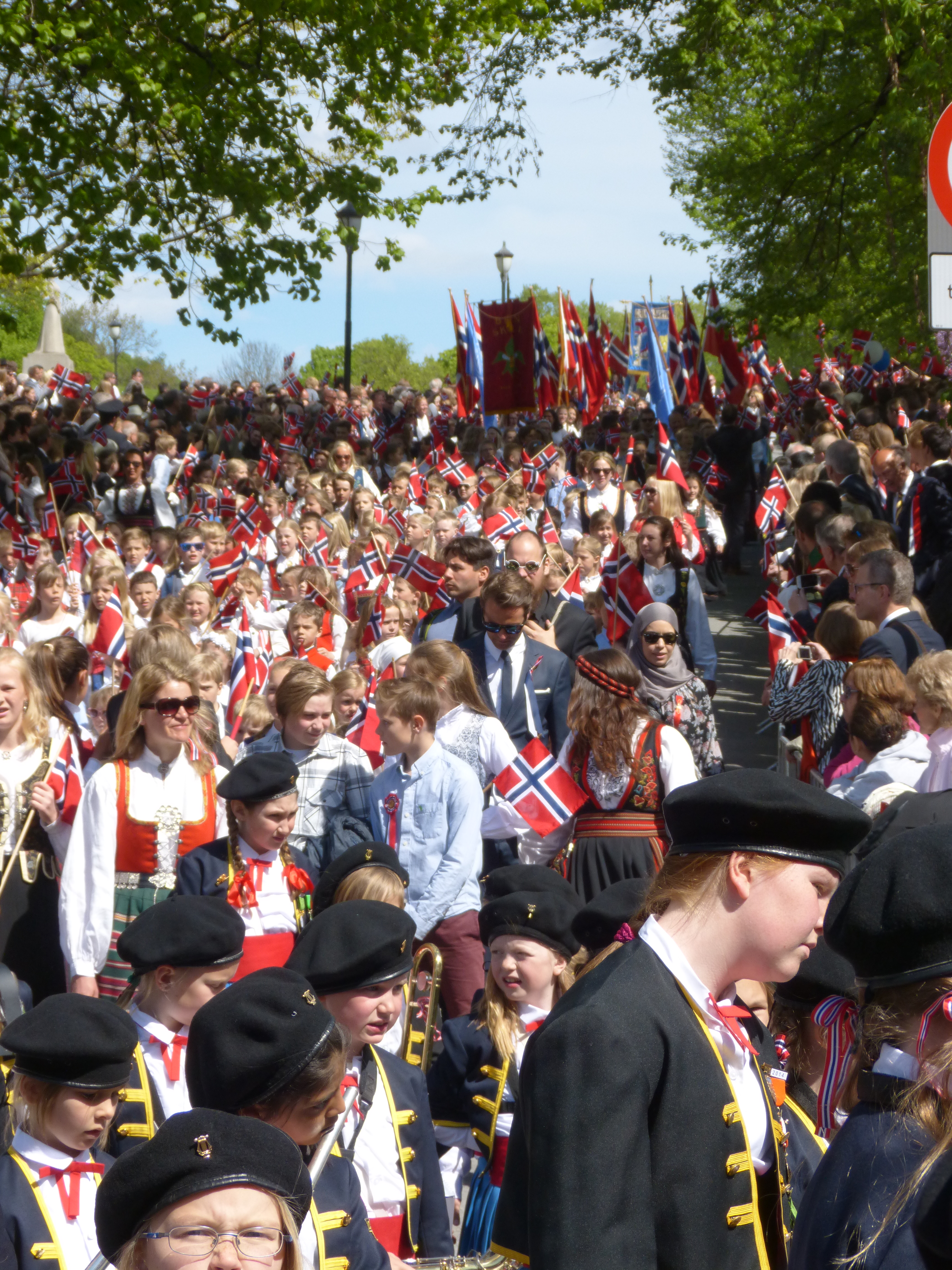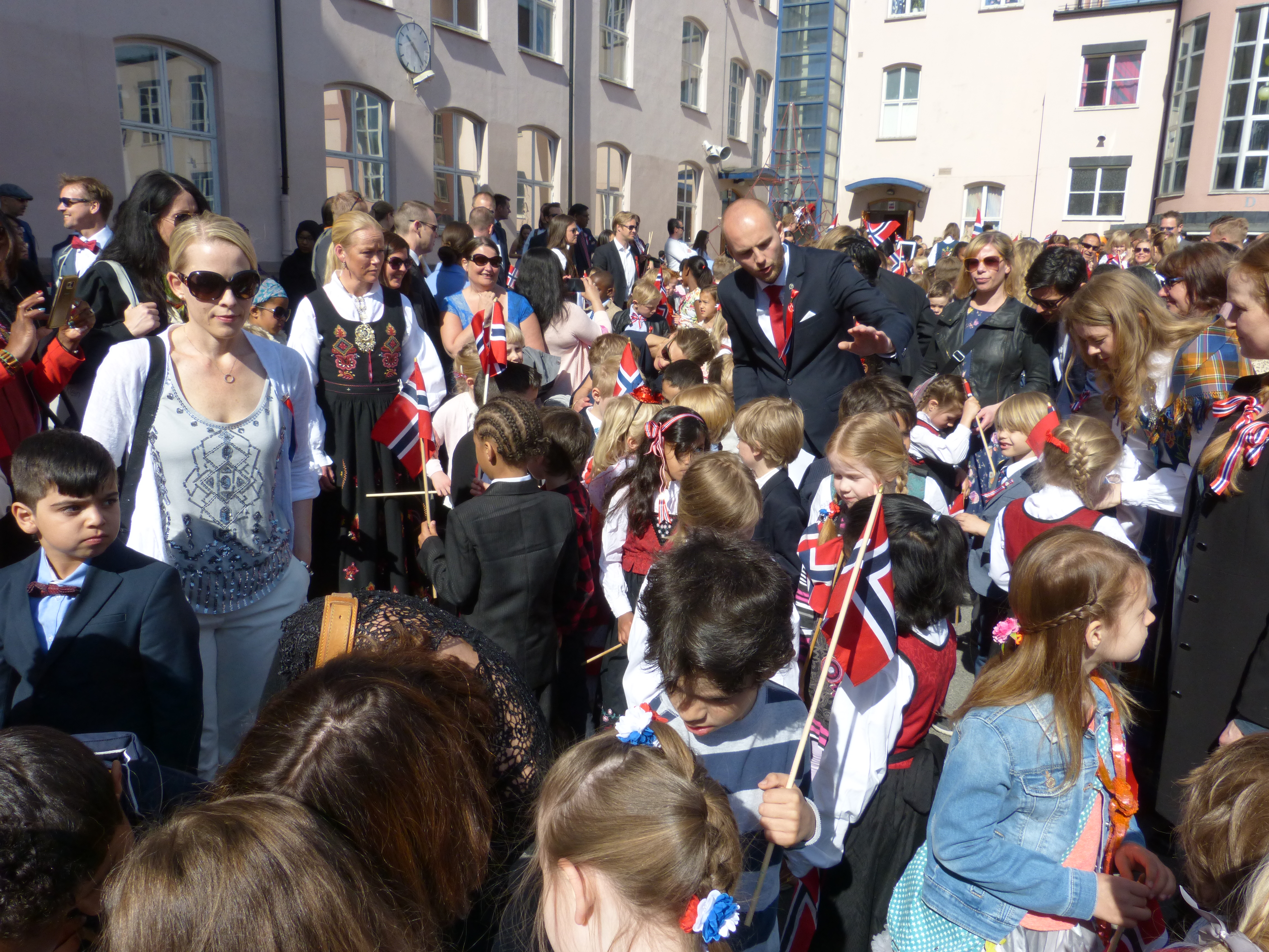 Den nybildade blåsorkestern på skolan spelade så ögonen tårades (de låter förfärligt rent objektivt sett, men om man har i bakhuvudet att ingen av dem ens hållit i ett instrument när de startade för sju månader sen så är det ganska bra helt plötsligt). Rektor talade och alla var lyckliga.Barnen ställer upp sig på skolgården med sina lärare (Hannes’ lärare uppe till höger-mitt) som försöker få kontroll på vilka som anmält sig för att vara med i tåget och kryssar av. Det ser ut som totalt kaos men det är det inte. Eleverna är duktiga på att hålla sig till sin lärare och sin grupp. Den vackra rosa skolan i bakgrunden.De små går i flock i tåget och några stora är fanbärare för skolan. Här har dom radat upp sig inför utgången från skolgåren och ner till samligen på Akershus festning där ALLA skolor (116 st tror jag det var i årets tåg) PLUS blåsorkestrar och drillflickor. Bakom mig föregår kaoset i förra bilden…Så här ser det ut när tåget väller ner från Slottsparken (slottet ligger uppe till vänster utanför bild) där alla vinkat till kungafamiljen. Det är svårt att beskriva och bör verkligen upplevas.En glad och rask carmencitakille kommer ned efter att ha vinkat till kungen & co. Nu är det slutspurten, bara några hundra meter (som tar ca 40 min att gå pga alla stopp som blir hela tiden) kvar ner till Rådhusplassen. Varje årskurs har med sig sina lärare och ett antal föräldrar som går med för att se att alla hänger med och inte försvinner i de helt obscent stora folkmassorna som är.En inte lika glad kille. Fem poäng till den som hittar Adam i vimlet. Tips: vit skjorta.Adam var så trött och varm efteråt att han nästan föll ihop. Han grät av utmattning och törst, och lovade sig själv efter tåget att aldrig mer gå barnetog. Det lovade han förra gången också för två år sen, så vi får väl se. En våffla, lite saft och annat gott och kul senare var humöret tillbaka på topp igen.