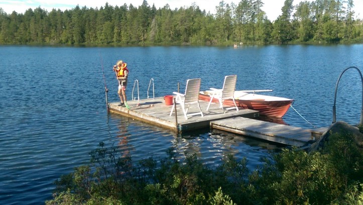 Äntligen är han så stor att han kan vara nere vid sjön själv och fiska. Nu slipper han tjata på vuxna om att följa med ner, och vi vuxna slipper sitta där nere och trä på mask och döda fisk.