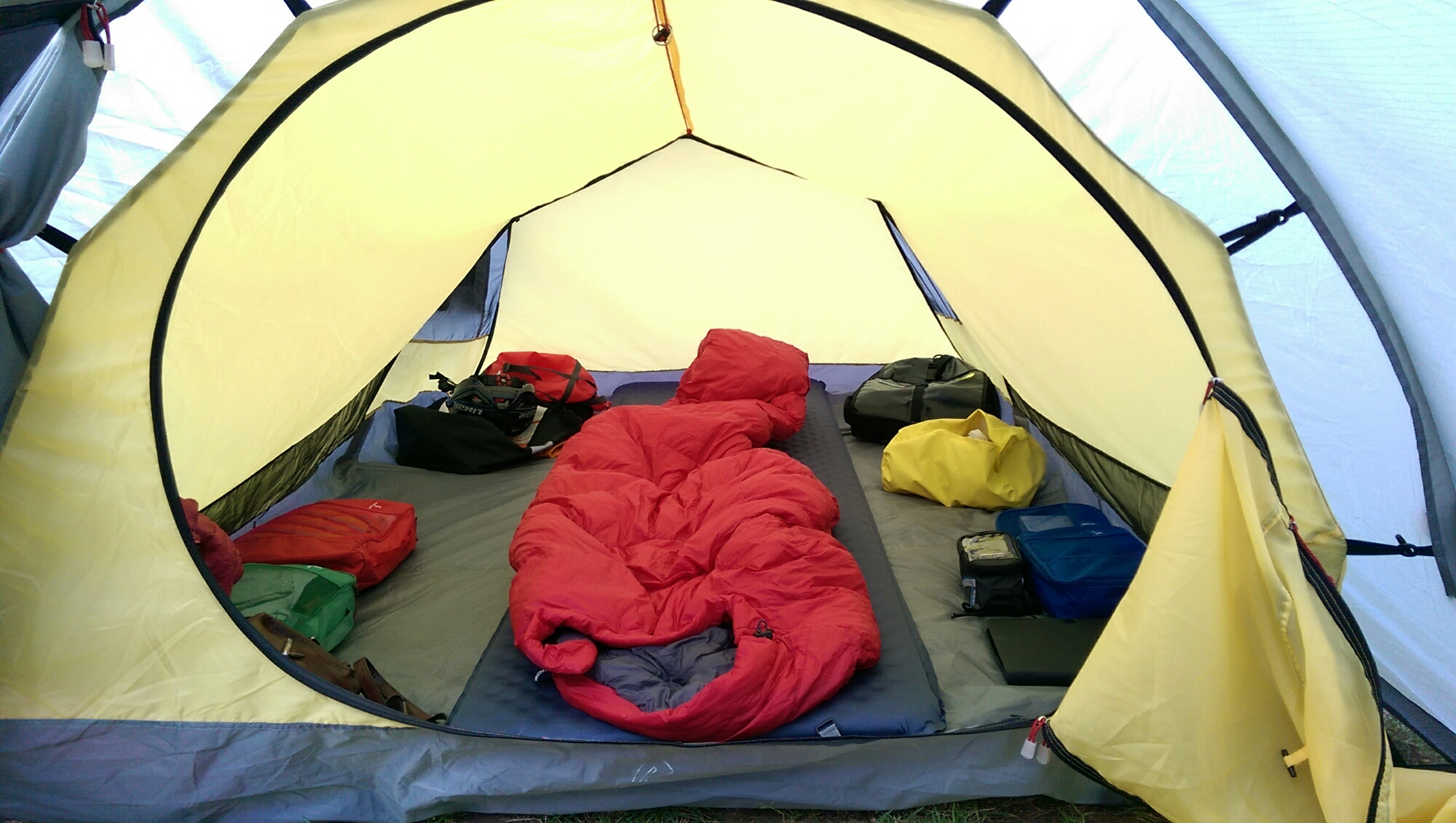 Var sak på sin plats, kläder på ena sidan, mat och gadgets på den andra, gott om utrymme för en person i ett tremanstält 😀